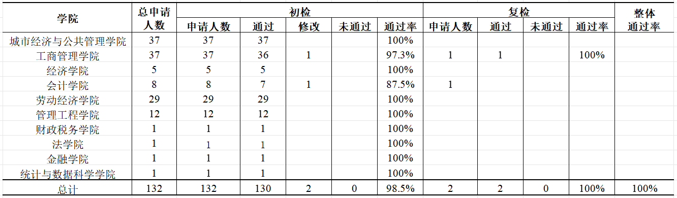 本次共有132人进行学位申请,通过10月10日的重复率初检,130人(98.5%)通过检测、2人(1.5%)需要修改。重复率复检中,提交的2人通过检测。本次学位申请我校整体通过率为100%。