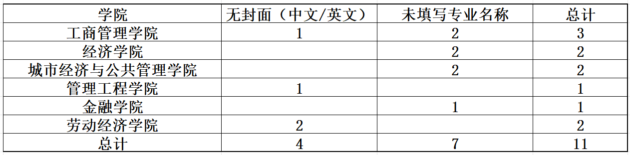 在学术不端检测后,学位办对全部提交的论文进行了匿名检查,通过检查发现,依然有论文格式不规范的问题出现,并且有很多学生未按学校要求,“过多”的隐去信息,比较突出的是删掉中文或英文封面和不填写专业名称的现象。删去封面会让论文看起来有失规范,不填写专业名称会影响专家对论文内容与专业归属是否相符的判断。为保证双盲评阅的规范,学位办已对学校送审论文的未匿名信息和未填写专业的问题进行处理后提交了评审,下面将以学院为单位对未做匿名处理的同学名单、学位论文无封面和未填写专业名称的人数进行公示,希望同学们未来能够引以为鉴: