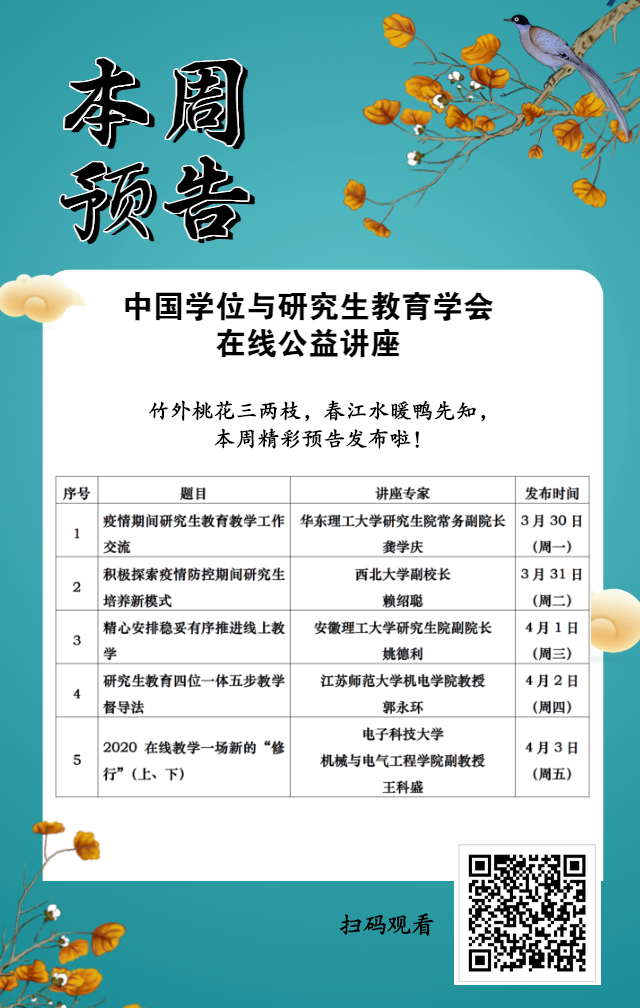 3月16日以来,研究生院全体工作人员又参加了中国学位与研究生教育学会举办的每日在线公益讲座学习。主题包括“疫情期间研究生线上教学工作”“疫情期间研究生培养创新模式”等内容。听讲座之余,研究生院又通过线上交流形式,把学习成果不断用于研究生教育教学管理实践,进一步促进理论与实践紧密结合。