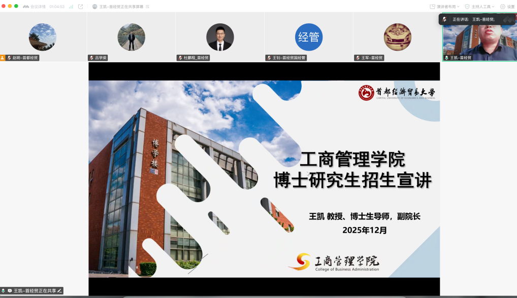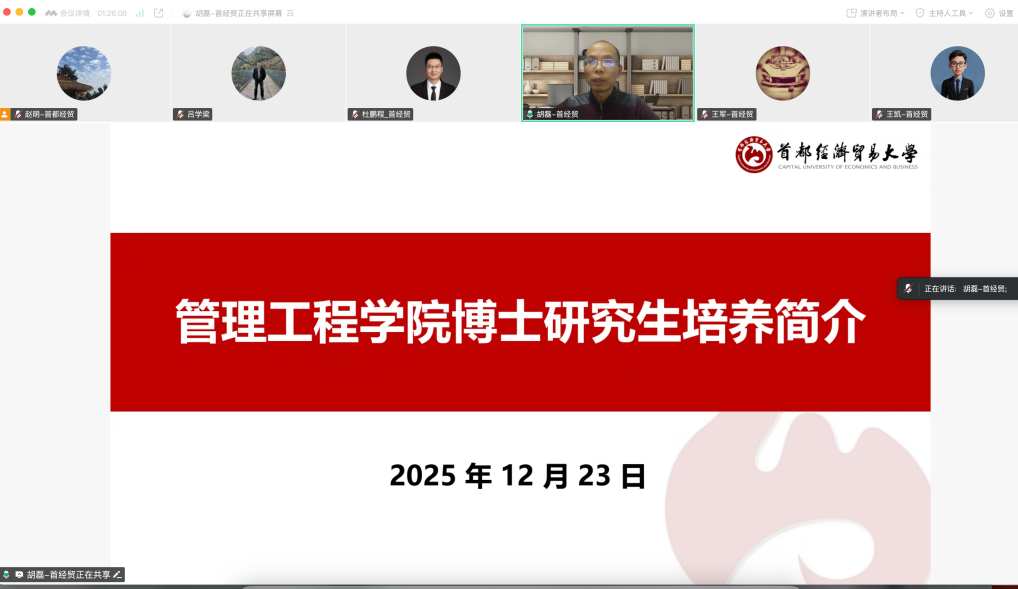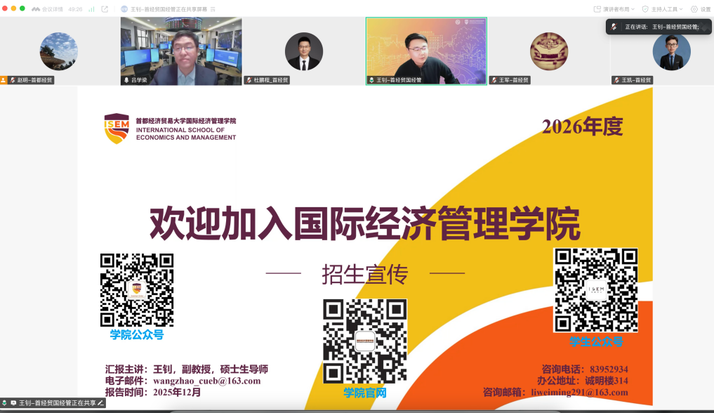 为提升我校博士研究生生源质量,加强校际之间的合作交流,2025年12月23日,我校研究生院院长王军、院长助理赵明,经济学院副院长杜鹏程,工商管理学院副院长王凯,管理工程学院副院长胡磊,国际经济管理学院副教授王钊,通过线上腾讯会议的形式对青岛大学开展博士研究生招生宣讲。本次活动由青岛大学经济学院院长吕学梁教授主持,青岛大学经济学院副院长李聪参与并协助组织本次宣讲活动。