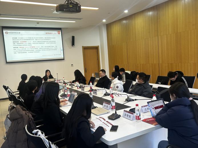 汇报内容涵盖气候风险应对、IPO监管治理、供应链绿色治理等众多前沿领域,汇报人综合运用OLS模型、双重差分模型等实证研究方法,结合准自然实验、案例分析、文本分析等手段,对各核心命题进行系统验证,为相关战略落地与政策优化提供实证依据与参考。点评环节,刘欢从汇报能力提升、研究设计贴合度、样本选取合理性等方面给出建议;罗肖依聚焦变量因果关系、稳健性检验规范度及地区差异影响提出见解;马云飙围绕研究贡献价值、央国企特殊情况考量及因果关系深度挖掘给出指导。