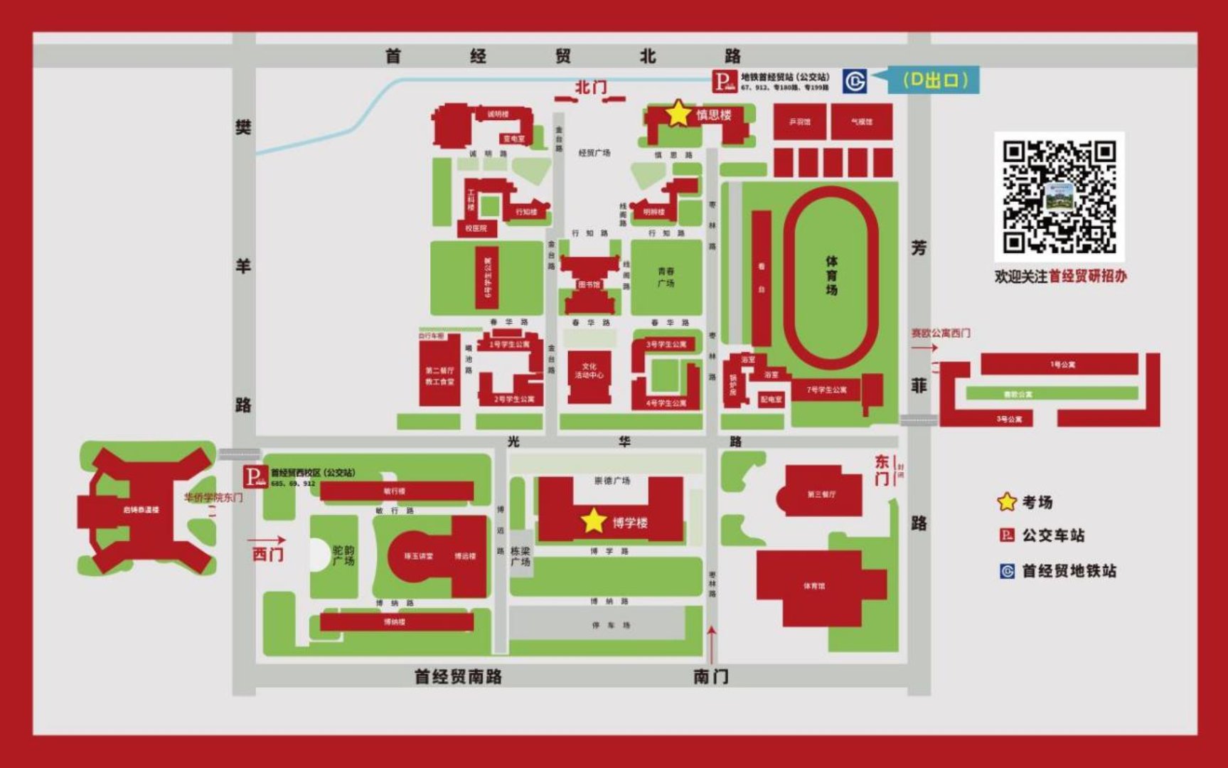 首都经济贸易大学考点具体地址为:北京市丰台区张家路口121号首都经济贸易大学校本部。考场分布在博学楼、慎思楼两个教学楼(具体位置见下图)。